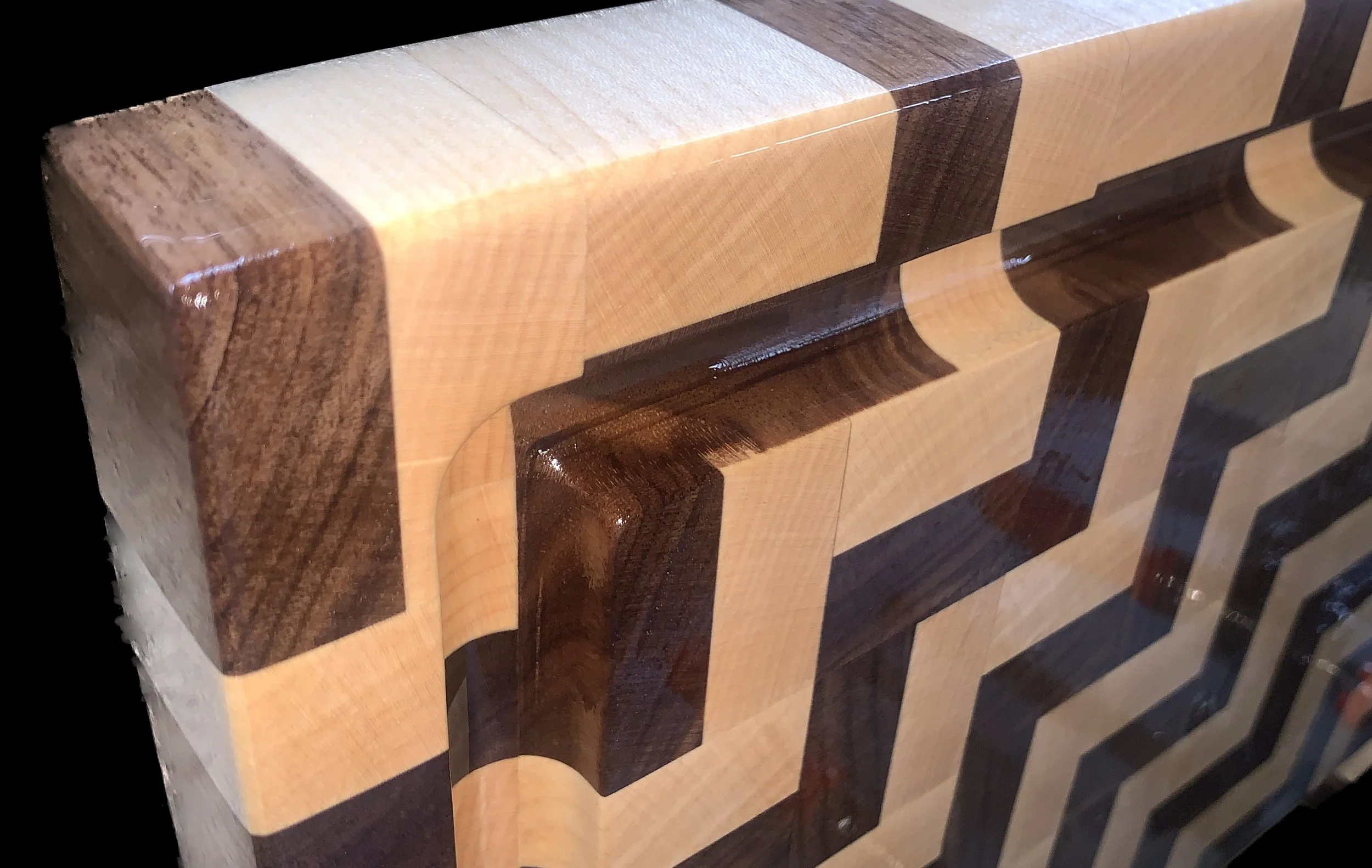 The colors and grain of the Walnut emulate the relaxing ambiance of the tea-stained waters of the Edisto. The Curly Maple frames the walnut like the Spanish Moss draped Oaks lining her banks to create to create a timeless hand-crafted edge grain beauty.
