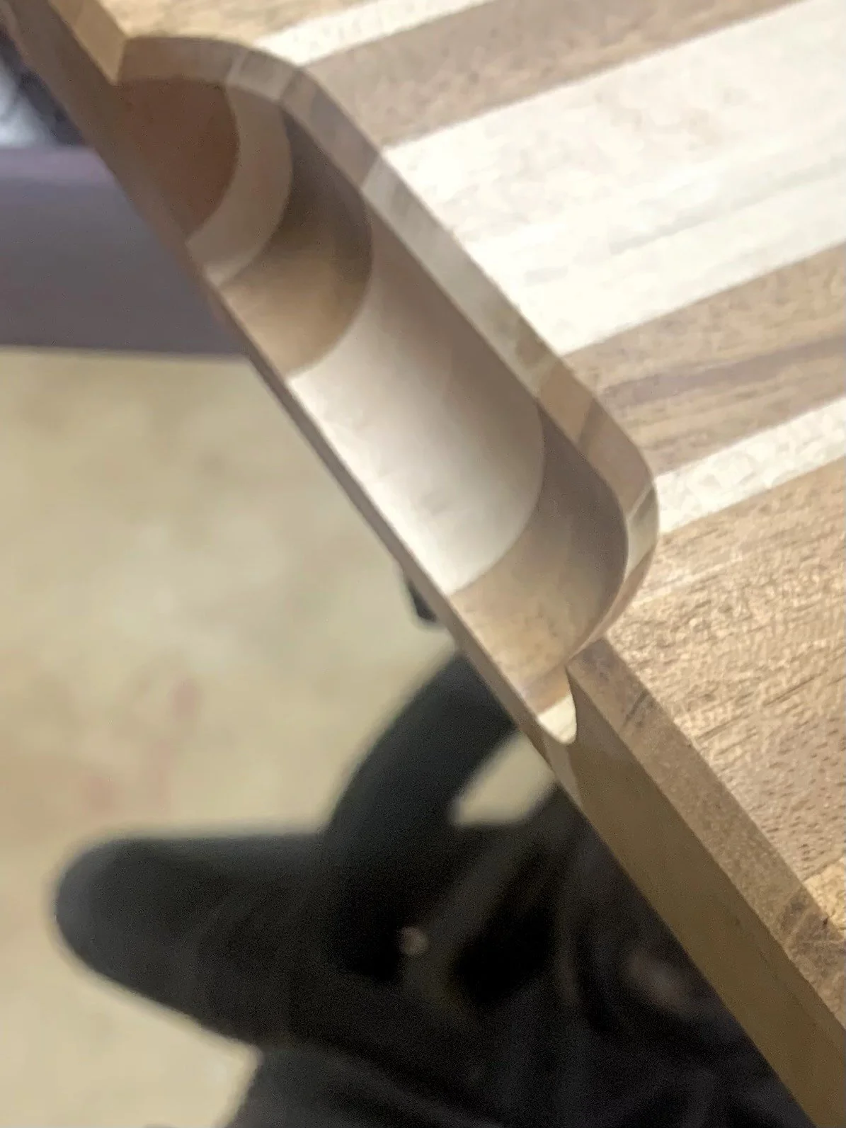 Your hand-crafted Dusty Board will come standard with a slight chamfer on the edges, rubber feet for stability and finished with an application of oil and two coats of Dusty Butter. Included with your purchase is a 4 oz tin of our Dusty Butter to maintain your Board in the future. You can customize your Dusty Board by trimming it with an optional 3/4” “juice groove,” and “hand holds” in the form of either finger holds or finger grabs for ease in handling. Pictures of these trim options can be found below.